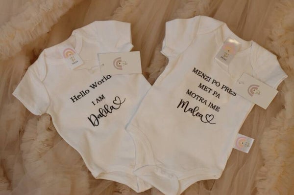 Personalisiere dein Babybody mit deinem Wunschtext. In allen Variationen und Sprachen verfügbar.